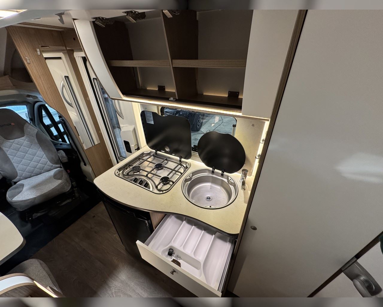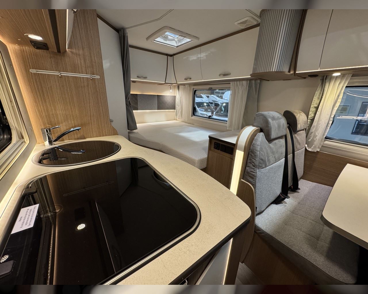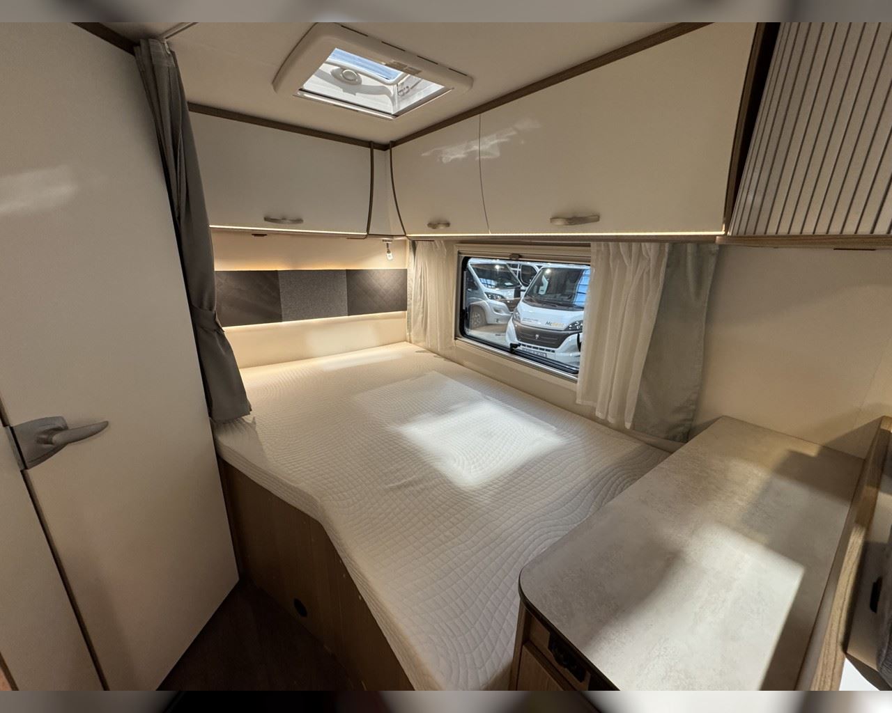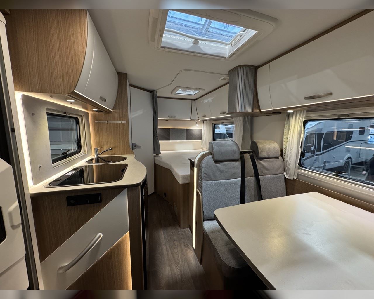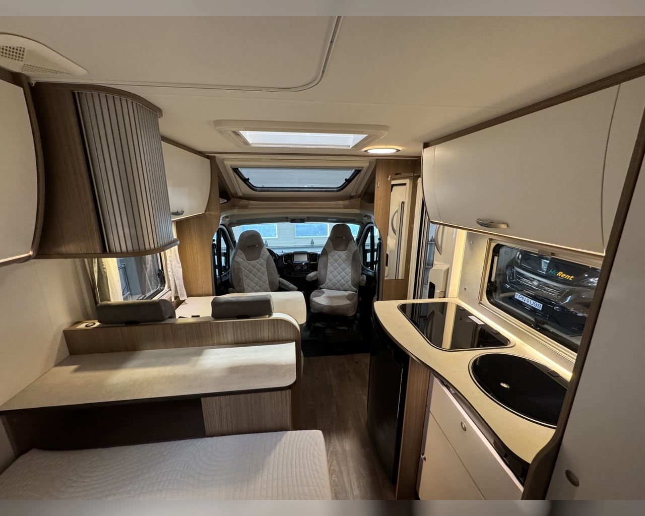 Kaupauki fylgir þessum bíl - 200W sólarsellupakki með ásetningu að verðmæti 136.000 kr. Bakkmyndavél, leiðsögukerfi, sólskyggni (markísa), sjálfvirkur ísskápur, hjólagrind, hliðar, 16“ álfelgur, cruise control, loftkæling, snúningsstólar, LED lýsing, samlit áklæði á framsætum o.fl. Lengd: 5,95 m. Breidd: 2,32 m. Hæð: 2,93 m.