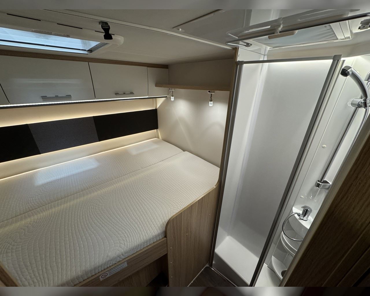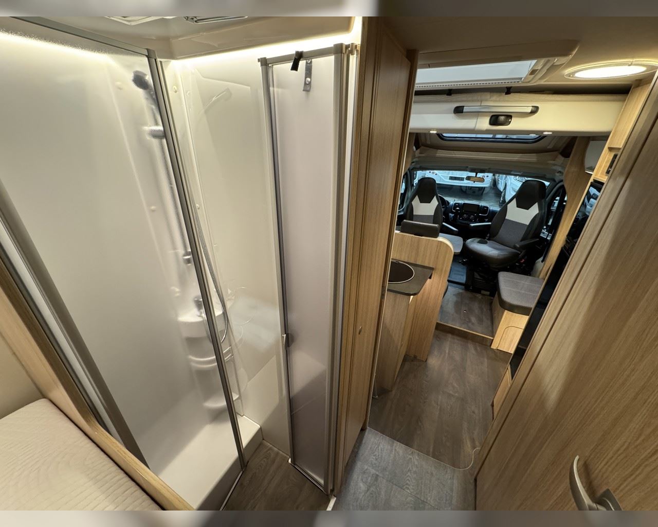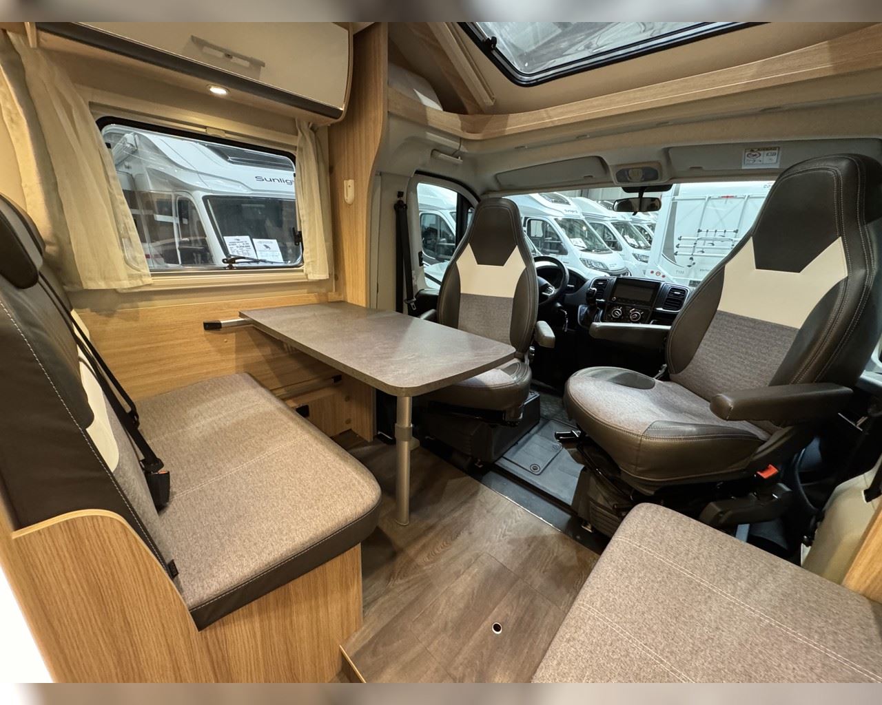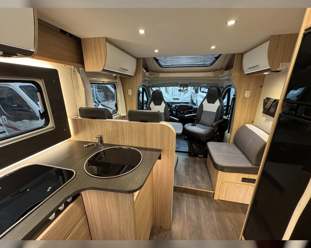 Kaupauki fylgir þessum bíl - 200W sólarsellupakki með ásetningu að verðmæti 136.000 kr. Trumatic Combi 6 KW (stóra miðstöðin), stór ísskápur, snúningsstólar (kapteinstólar), samlit áklæði á framsætum, aðskilin sturta og klósett, fellirúm fyrir ofan borðaðstöðu, rafdrifin trappa, stór geymsla undir rúmi með lestarlúgum beggja vegna, díóðulýsing (LED), flugnanet í hurð, hjólagrind fyrir 4 hjól, markísa. L.: 6,99 m. Br.: 2,33 m. H.: 2,9 m.