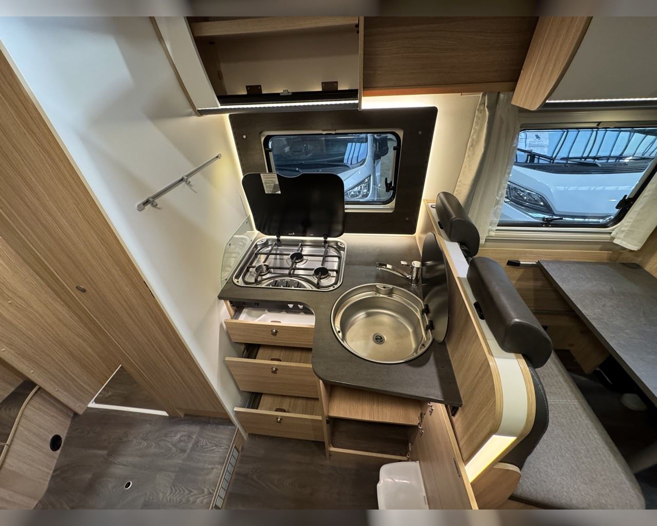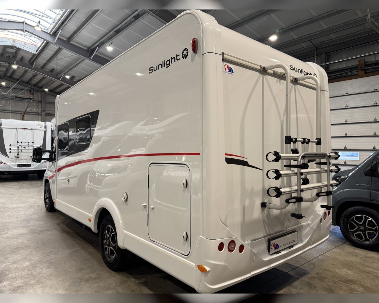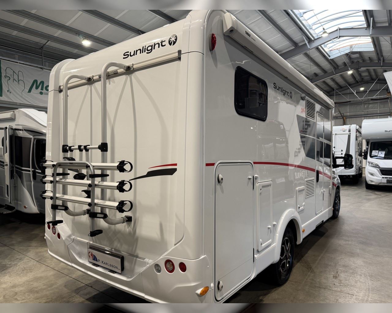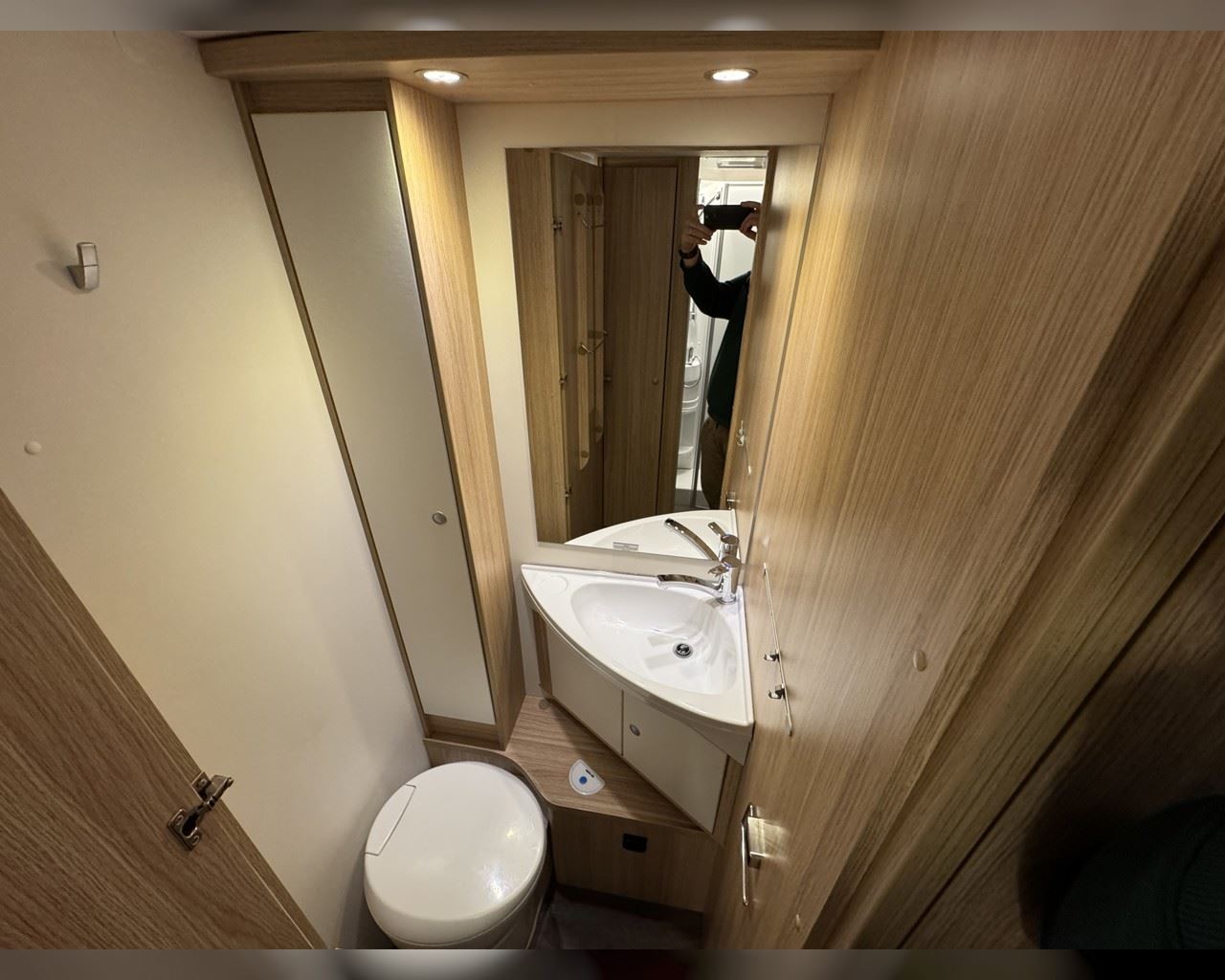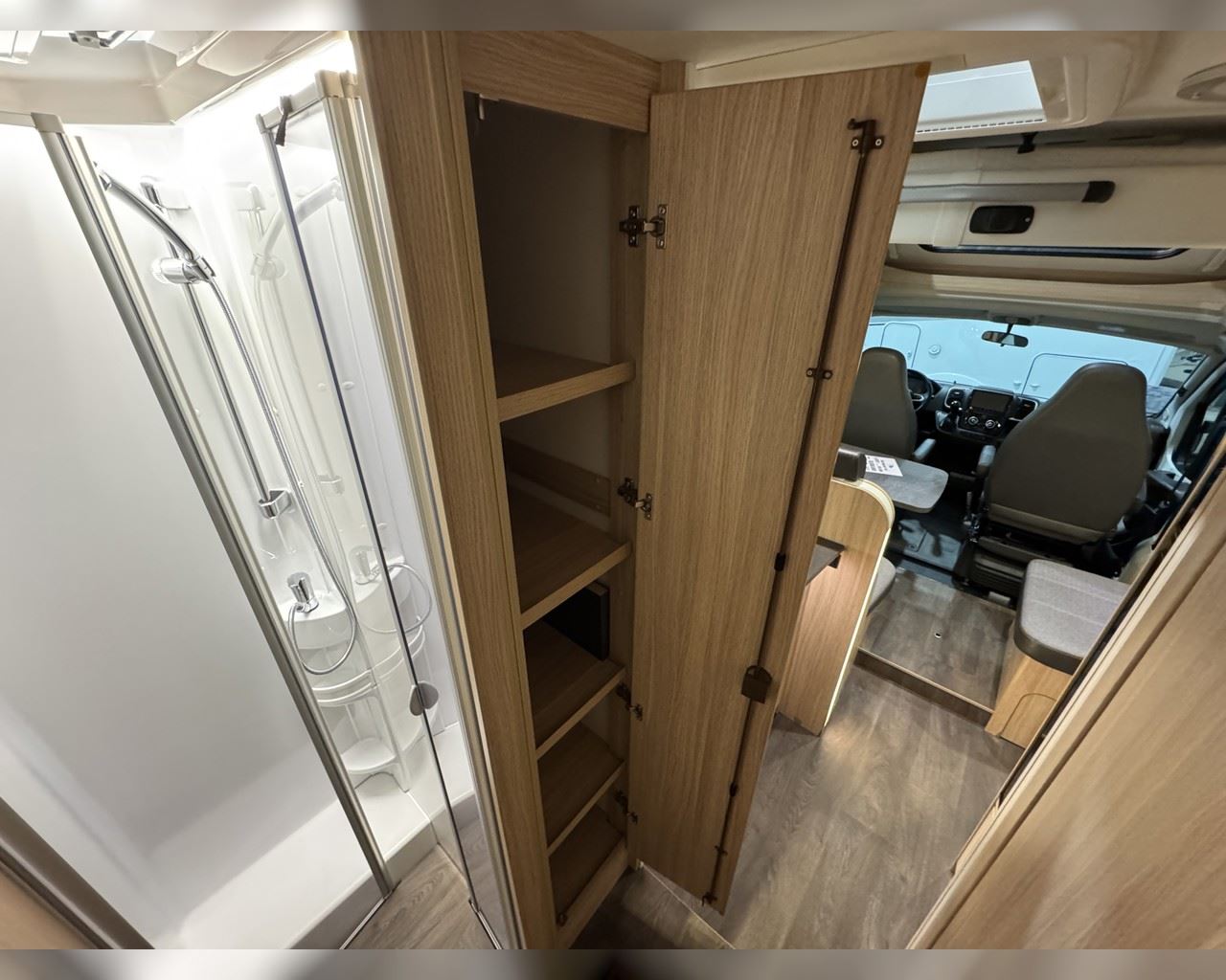 Kaupauki fylgir þessum bíl - 200W sólarsellupakki með ásetningu að verðmæti 136.000 kr. Trumatic Combi 6 KW (stóra miðstöðin), stór ísskápur, snúningsstólar (kapteinstólar), samlit áklæði á framsætum, aðskilin sturta og klósett, fellirúm fyrir ofan borðaðstöðu, rafdrifin trappa, stór geymsla undir rúmi með lestarlúgum beggja vegna, díóðulýsing (LED), flugnanet í hurð, hjólagrind fyrir 4 hjól, markísa. L.: 6,99 m. Br.: 2,33 m. H.: 2,9 m.